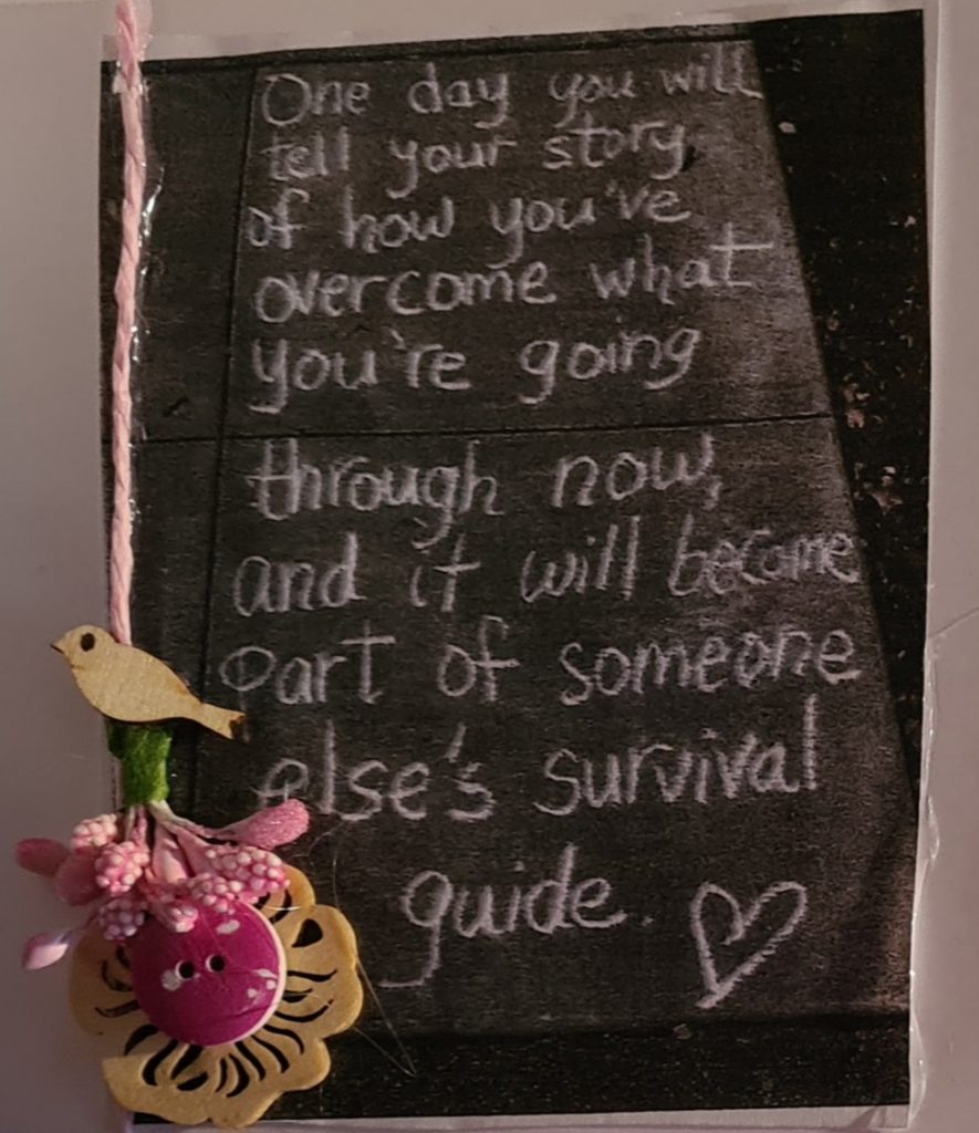 During my journey I had people who cared or who went that extra mile, my midwife , who then got me in touch with women’s aid, who then supported me for the first 2 years. My outreach worker “ my guardian angel” I call her! She got me accommodation , help me furnish it, even got me baby things and helped me get back a life without his abuse. She always went that extra mile,  nothing was ever too much.  Even when he found me and I was rehomed again she stuck by me and would be there at the end of the phone to hear my tears and fears.