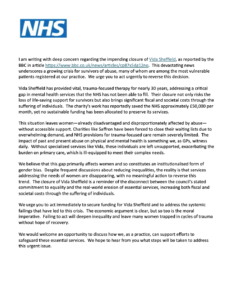This is an incredible letter of support from a Sheffield based GP and demonstrates the strength of feeling amongst GPs who fear losing the specialist service Vida Sheffield provides.  Vida is not considered as a key provider in the pilot of Womens Health Hubs in Sheffield https://whh.pcwhf.co.uk since longterm mental health recovery is not a priority – where will those traumatised survivors of abuse go?